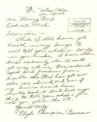 Such was Clyde Barrow's appreciation for the Ford V8 that he supposedly penned and mailed the following laudatory letter to company founder Henry Ford in April 1934: The letter bore a postmark indicating it was mailed from Tulsa, Oklahoma, on 10 April 1934, and it was received by Henry Ford on 13 April 1934 at his office in downtown Detroit.
