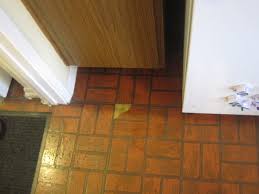 Below at left is a similar thin vinyl 12x12 white brick floor tile pattern from a 1983 home that we suspect is asbestos free, while at below right is another example of th herringbone white brick floor tile pattern that I think this is the same type of flooring as in our photo at above left. For the floor at above left, most likely as a 1983 home this is post the asbestos floor tile era, though it's at the edge of that time. I've had some reports from readers testing later 12x12 tiles that did not find asbestos in them and reports from other readers testing what we think were older tiles from the 1970's that did contain asbestos. Below are two more photographs of this popular Armstrong floorg, Romsford Brick white. Romford Red was also a popular pattern. If you have to guess about the asbestos risk with this tile, guess that the 9x9" versions of this flooring most likely contain asbestos, that some later versions might in either size, but that latter productionof the 12x12" flooring may not contain asbestos.