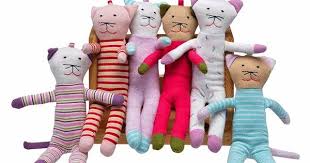 Each of the 3 blocks in the set makes a different sound – a squeak, rattle, and bell. Available online, $33.This cute toy is made in Bangladesh by talented artisans at Hathay Bunano, a non-profit organization that provides employment opportunities for women working from home. The rattle is knitted by hand from 100% cotton yarn, with 100% polyester fill. In U.S., it is available on the Kahiniwalla website, which has lots of other cute animals to choose from.