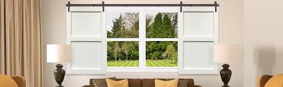 Contact us to have a Sunburst Shutters professional measure your windows today!Sliding Barn DoorsSliding Barn Doors Ask us about our color-matching capabilities and be sure to check out our selection of Door Hardware and our Track and Glide System. Slimline Barn Door Slider Our Slimline Barn Door Slider is perfect for projects with limited space. The exposed track and guide assembly add a chic industrial style that give any room a modern edge. Compliment your project’s unique design aesthetic with privacy glass options, and handles or door flush pulls to complete your look. Glass panels available in 1⁄4” tempered: frosted, ribbed and patterned; and 1⁄2” laminated cracked/clear, obscure and color. Custom options are also available. Double Slimline Barn Door Slider Twice as nice, use our Double Barn Door Slider to create more impact in a room. Available as shown, with exposed industrial-style hardware or with matching wood valance. Slimline Barn Door Slider with Valance