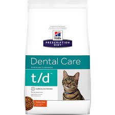 Dental CareDental care for your pet may be more important than you think. The accumulation of bacteria laden plaque above the gumline can lead to long term oral health issues. Recent studies have demonstrated there is an association between oral health issues and systemic general health issues affecting the kidney, heart and metabolic systems.Hill's nutritionists & veterinarians developed Prescription Diet® t/d® clinical nutrition especially formulated to support your cat's dental health. In fact, t/d is clinically proven nutrition to reduce plaque, stain, & tartar buildup. [VOHC Seal for Plaque & Tartar] "100% Satisfaction Guarantee" We're confident your pet will enjoy Hill's® Prescription Diet® foods. We're so confident that we offer a 100% money-back guarantee.* Made in our own USA facilities with U.S. and imported ingredients. Hill's Prescription Diet® t/d® Feline is a complete and balanced food that provides all the nutrition your cat needs. Please consult your veterinarian for further information on how our Prescription Diet® foods can help your cat to continue to enjoy a happy and active life.