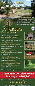eco friendly community, Asheville eco friendly houses, eco friendly community Asheville NC The idea is simple -- to create a community, not a subdivision. Click here for overview video of Crest Mountain The Villages at Crest Mountain is a comprehensive green-built neighborhood 4.5 miles from downtown Asheville, North Carolina. This affordable eco-community embraces social interaction and fellowship, organic food production, renewable energy, healthy built construction, and shared resources. The Villages at Crest Mountain offers a mixed use, sustainable neighborhood with prices well within reach of the majority of Asheville homebuyers. On-site amenities enable residents and families to enjoy a simple, natural lifestyle in step with cutting-edge sustainable technology: VCM is proud to boast: Stylish, healthy built and energy efficient homes Two different lot phases, giving options of smaller affordable homes adjacent to acres of green space or larger elevated wooded lots offering panoramic views.