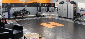The rigidity of the material allows the garage floor tiles to be designed with a grid on the bottom side that permits air and water passage. This grid feature prevents moisture from becoming trapped under the tiles. Petroleum products such as grease, oil, antifreeze or most household chemicals do not easily affect the floor tiles. Cleaning the tiles is simple. Just wipe them clean with a sponge mop using a mild soap and water. These interlocking floor tiles can withstand heavy foot traffic and heavy rollover weight of large vehicles including SUVs and pickup trucks. This makes the tiles especially suitable as a garage flooring solution. There is no surface preparation needed other than sweeping the garage floor clean. Installation of these tiles is very simple because no special tools are required. They interlock together with a loop-to-peg system to create a “floating floor.” When installing the tiles, it is important to leave a 1/2-inch gap minimum around permanent objects to prevent buckling.