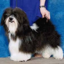 Appearance Energetic, gentle, and fun-loving, the Havanese looks like an aristocratic little dog – but really isn't. While the long coat can make your pet look delicate if it's groomed to be soft and silky, the dog is actually very sturdy. As a toy breed, the Havanese stands 8 to 11 inches at the shoulder in adulthood and weighs an average of 7 to 16 pounds. With a whimsical expression and lively, expressive eyes, what's really notable about this breed is its lively, "springy" gait. A dog which literally bounces through life, this trait is a perfect match to its personality, indeed. With long ears, a tail that cheerfully arches up over the back, and a black button nose, "adorable" is a good descriptive word for this dog in any context. Coat colors can be anything, including silver, white, cream, gold, black, or blue, tricolor and particolored. Show colors in North America are all recognized, although many North American breeders prefer black or chocolate. Show dogs that are considered chocolate must have at least a 1 inch patch of chocolate hair.