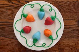 Place the dipped strawberries on wax paper to harden. As you set each one down, make sure it’s sitting nice and level. If not, hold it in place for 30 seconds or so until the chocolate hardens enough to support it. This will make the lights look nicer when you place them on a serving platter. Here’s a super cute way to serve the strawberry lights. First, place them on a white serving platter. Then, to decorate the platter, melt some more green chocolate and put it into a disposable icing bag fitted with a round tip.
