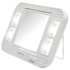 Foldable holder for easy setting. Lighted Travel & Home Folding 10X Mirror, Gray Case Oval mirror on an adjustable handle with energy-saving LED lighting. the back side features ten-fold magnification. Elegant metal frame with brushed nickel finish adds a modern accent to a bathroom decor. It is impressive and very practical mirror mounted LED wall features a stylish frame that is perfect for the bathroom or dressing room. Excellent lighting can make a perfect make-up. Add this make-up mirror to your vanity table and enjoy the extra convenience it offers you with the LED lighting and adjustment options, while the light finish makes it fit perfectly in any surroundings. A cool addition to your vanity table with the magnifying feature that will prove perfect for applying make-up or shaving. And since it is extendable, you can just pull it forward or stow it away against the wall, when you're not using it. It's super practical mirror is the perfect gadget that allows you to do a perfect make-up.