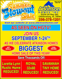 Jemison, Montevallo, Montgomery, Moody, Odenville, Ohatchee, Oxford, Pelham, Pell City, Pinson, Pleasant Grove, Pratt City, Rockford, Springville, Sylacauga, Talladega, Thorsby, Trussville, Tuscaloosa, Vincent, Weogufka, and Wilsonville and other parts of Alabama. Therefore, whether you drive near or far away our promise to our customers is to offer our “Unbeatable Low Price Guaranteed.” Not only will you receive the savings we offer when you buy from Atkinson Homes, you will absolutely “Get More For Your Money.”
