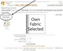 Supplying Your Own Fabric (Curtain Make Up Service) Congratulations on finding your chosen piece(s) of fabric and deciding to use our curtain-make-up service! Just follow the steps and guidelines below, don't forget that included in our price is the lining fabric and any other sundries. In deciding to supply your own fabric for your made to order curtains it is EXTREMELY important to ensure the following things agree to the order details.... The fabric roll width (cm)The fabric pattern repeat (cm) Sending Your Fabric To Curtains Made Simple Send your fabric using registered post or courier with insurance.Make sure that your fabric is folded in such a way that excessive creasing is avoided. Wrap the material appropriately to avoid damage in transit.If supplying more than one type of fabric design, label each piece of fabric so that it can be easily matched to the related curtain design(s). How Do I Select "Supply Own Fabric"? Click on the button titled 'Supply Own Fabric'.