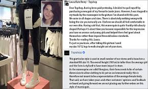'Thanks for reading this, Laura. P.s just so you know, after taking this picture I used my size 10/12 legs to walk straight out of your store.' Her comment was shared hundreds of times and prompted more than 1,000 other comments.Topshop initially asked for details to contact Miss Berry privately but later posted a public response in which it admitted using mannequins with unrealistic proportions.'This particular style is used in small number of our stores and is based on a standard UK size 10,' its response read. 'The overall height (187cm) is taller than the average girl and the form is stylised to have more impact in store.'As the mannequins are solid fibreglass, their form needs to be of certain dimensions to allow clothing to be put on and removed easily; this is therefore not meant to be a representation of the average female body.' TOPSHOP MANNEQUIN DIMENSIONS Height: 6ft 1in (187cm) Average UK woman's height: 5ft 3 (160cm) It then agreed not to order the mannequins again in light of shoppers' comments.