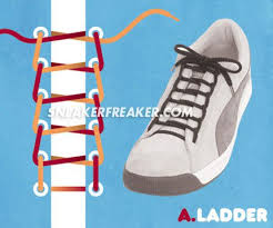 At the top set of eyelets, the laces can once again cross over and pass under the straight section as shown. This not only looks consistent with the rest of the lacing but also forms a High Lace Lock, which tightens the lacing even more firmly.The ends are looped back under the lace where it feeds under the side of the shoe 3. The ends are then crossed over each other, then they go under and out through the next set of eyelets up the shoe 4. Steps 2 and 3 are repeated until both ends reach the top eyelets. 1. The lace runs straight across the second set of eyelets from the top of the shoe 2. Cross the ends over and feed into the fourth set of eyelets, skipping the third set 3. Continue down the shoe, two sets of eyelets at a time 4. At the bottom, run the laces vertically between the bottom and second from bottom eyelets 5. Double back and work your way back up the shoe through the vacant sets of eyelets.The left (red) end is spiralled up the left side of the shoe, with the end fed under and emerging from each eyelet 3.