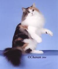 The Norwegian Forest Cat's body is large, muscular and substantial. Its strength and agility make it a natural hunter able to climb any surface. The water-resistant, semi-long coat with a dense undercoat developed to help the cat survive in the harsh Scandinavian climate. During the cooler months, the ruff is full and the dense woolly undercoat thickens to protect the cat from the cold. In the summer, the coat will be shorter although it will still have a water repellent texture. The tail is long, full and flowing. While the coat is full and dense in the winter months, it is also a coat that does not require the daily care of some other longhaired breeds. It is a good idea, though, to give a little extra combing in the Spring when it is changing its heavy winter coat for its summer one. Its minimal care requirements make this the ideal longhair for the busy active family! The Norwegian Forest Cat's head is the shape of an equilateral triangle, the profile of the nose long and straight.