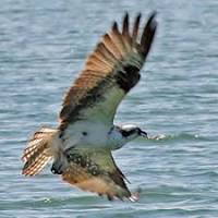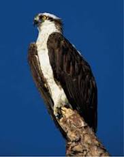 Ospreys range in size from 21" - 25" long with a wingspan of 59"- 67". Females are about 10 percent larger than males weighing from 2.5 - 4.25 pounds while males weigh 2.25 - 3.75 pounds. Immatures are similar to adults except the upper feathers have light edges, while the underparts are buffy. Ospreys are primarily found along streams, rivers, lakes and reservoirs where they forage for fish. The osprey’s main prey is fish. This bird is the only raptor to plunge into the water for prey. Usually, the osprey will hover 30 - 100 feet above the water watching for fish. When a fish is spotted, the osprey dives feet first into the water and is often momentarily under the surface of the water. Once capturing the fish, the osprey leaves the water, shakes the water from its feathers and positions the fish in its talons so that the fish’s head faces forward. This decreases wind resistance as the osprey flies. Ospreys are reported to be able to carry up to 2.25 pounds, but most fish are in the 0.5 lb. range and are 5-15" in length.