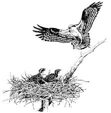 Osprey occasionally eat rodents, birds, small vertebrates and crustaceans. To feed their young, adult ospreys tear off small pieces of fish when the chicks are very young and adjust size as they get older. A brood of three chicks requires nearly two pounds of fish daily. The osprey’s method of catching prey calls for some adaptations not found in more terrestrial hawks. The osprey’s feathers are slightly oily to limit water absorption. The shank of the leg is scaled, not feathered, with short, dense feathering on the thighs. The pads of the toes are covered with spicules (small spikes) for grasping slippery fish. The osprey also has a reversible outer toe that can either be at the front of the foot or moved to the back for a two toe forward, two toe back formation for carrying fish. Osprey build nests near the water; 10 - 60 feet above the ground near the tops of trees. They can also nest on the ground or on cliffs and use a variety of structures, including power poles, chimneys, channel markers, and duck blinds.