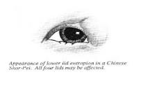 Unlike his owners, he starts off with a lot of wrinkles that gradually disappear as he reaches adulthood. Your Shar Pei's wrinkles are caused by a mutation that creates an abnormal amount of hyaluronan around his cells. This gel-like substance in the formation of his facial folds weakens his eyelids by making the edge of the eyelid weaker and the lid heavier. This is one factor in the development of entropion, a condition that shar peis are at a high risk to develop. Irritants in the environment are an additional potential cause. Vets and breed standard clubs agree that a dog who has been treated for entropion shouldn't breed as there is a significant hereditary factor in the condition. Entropion Treatment As you'll notice, your Shar Pei's eyes are deep set and there is little support for his eyelids. Consequently, his eyelids, and his eyelashes, may roll inward. The eyelashes cause an irritation by scratching the eyeball. An irritant, such as dust, can cause the same problem. This is called "spastic entropion" and the vet treats it with opthalmic drops initially to relieve the discomfort.