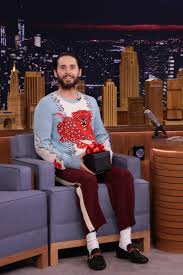So it’s no wonder that the latest four-legged fancy has rubbed off on brand spokesman and friend of Michele, Jared Leto, who made more than just a small statement when he wore Gucci’s big-cat motif in two different ways in less than 24 hours. While promoting his new film, Suicide Squad, Leto first curled up on Jimmy Fallon’s couch for an afternoon taping of the Tonight Show in Gucci’s powder blue knit replete with a red panther design.