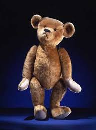 what the American bear looks like and the characteristics which can be used to identify them from other countries teddy's. company did not have any trademarks in the early days. A loose label in the shape of a circus wagon came later, followed by some less ornate labels with just the word Ideal on it. The bears made by this company were often identified by their very round ears which is shown in this picture of the bear presented to the Smithsonian in 1964 which is said to be the first bear inspired by Theodore Roosevelt. However the company did experiment with some other designs such as the1904 Mrs Robinson bear, which had less protruding round ears and had a rather protruding and pointed hump on her back. American teddy bear company had a short manufacturing life but during this time they made quality toy bears. A rare example of one of their bears is the 1907 "Blissful" bear which carries the companies label stitched to the bottom of the foot.