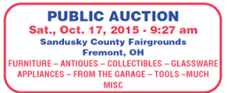 PUBLIC AUCTIONSat., Oct. 17, 2015 – 9:27 amSandusky County FairgroundsFremont, OHFURNITURE – ANTIQUES – COLLECTIBLES – GLASSWAREAPPLIANCES – FROM THE GARAGE – TOOLS –MUCHMISC 10/17/15 at 9:27 AM EDT Location: 901 Rawson Ave, LOCATION: Sandusky County Fairgrounds, 901 Rawson Ave., Fremont. Take the by-pass around Fremont to the SR 53 North exit, at stoplight turn south towards town to fairgrounds. SELLING ORDER: Selling from 2 Auction Rings in Jon’s Dream Barn. Ring #1 will start with Furniture, Appliances, and then move to Tables of glassware, collectibles & household items. Ring #2 will start with items located outside of Anderson Barn being Lawn Mowers and Lawn & Garden, then will move inside buildling on SHop Tools & Misc, Over 60 skids of box lots choices. RING #1 – FURNITURE, APPLIANCES, PATIO FURNITURE, REC & WEIGHT ROOM ITEMS FURNITURE: Primitive 2pc Oak Bakers cabinet w/3 door, 6 drawer & 1 bin top over 2 drawer 2 bin btm;