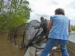 It is illegal to commercial fish for eels within one-half mile below any lock or dam in these areas.Legal traps are rectangular pots no larger than 24 inches x 24 inches x 15 inches and cylindrical traps no larger than 15 inches nor smaller than nine inches (9") in diameter and no greater than 36 inches in length.Both types of traps must be constructed of material with a mesh size no smaller than one inch x one-half inch (1" x 1/2"), except the throat (or muzzle) and the end opposite the throat (or muzzle) of cylindrical traps. There is no restriction on the construction material for the throats and ends of the cylindrical traps. The size of the hole in the throat of both types of trap must be limited by a two inch (2") steel ring attached to the throat.Each individual trap must have a tag attached to it bearing the name, address and commercial fishing license number of the person using the trap.All fish other than eels and eels less than six inches (6") long must be immediately released where they are caught.