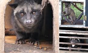Confined to tiny, filthy cages and suffering from skin infections, this is how farmers are treating Asian civet cats which produce one of the most expensive coffees in the world.The shocking conditions were discovered by animal investigators on farms in Indonesia and the Philippines which produce the much sought-after kopi kuwak, sold in Harrods and which can cost up to £60 a cup in some restaurants.Locals pick the ‘coffee beans’ from the faeces the cats which eat the ripe coffee berries as part of their diet. Once they are cleaned they are roasted. The coffee they produce is described as filled with a deep, mellow flavour, not acidic, with a ‘unique, soft, sweet taste’.However, undercover video footage shows civets exhibiting neurotic behaviour such as incessant pacing, spinning and head-bobbing – indications that the wild-caught animals are going insane from boredom and depression. Caged: A civet cat on a farm in Indonesia. An investigation found the animals, which produce the sought-after kopi kuwak coffee, suffer in appalling conditions